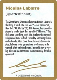 The 2000 World Championships was Nicolas Labarre's third Top 8 finish at a Pro Tour event (Rome '98, New York '99, Worlds '00). This Rennes, France native played a combo deck that he called "Chimera". This deck used searching cards like Academy Rector and Enlightened Tutor to fetch Fecundity, Saproling Cluster, and Ashnod's Altar. Once those three cards were in play, Labarre could generate as much mana as he wanted. With unlimited mana, he could play a very big Blaze or use Whetstone to immediately deck his opponent.