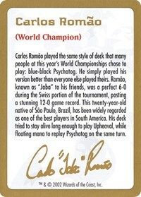 Carlos Romao played the same style of deck that many people at this year's World Championships chose to play: blue-black Psychatog. He simply played his version better than everyone else played theirs. Romao, known as "Jaba" to his friends, was a perfect 6-0 during the Swiss portion of the tournament, posting a stunning 12-0 game record. This twenty-year-old native of Sao Paulo, Brazil, has been widely regarded as one of the best players in South America. His deck tried to stay alive long enough to play Upheaval, while floating mana to replay Psychatog on the same turn.