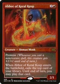 When Abbot of Keral Keep enters the battlefield, exile the top card of your library. Until end of turn, you may play that card.