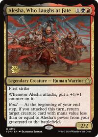 Raid — At the beginning of your end step, if you attacked this turn, return target creature card with mana value less than or equal to Alesha's power from your graveyard to the battlefield.