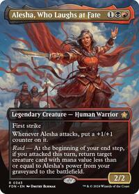 Raid — At the beginning of your end step, if you attacked this turn, return target creature card with mana value less than or equal to Alesha's power from your graveyard to the battlefield.