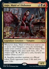 Whenever Anje, Maid of Dishonor and/or one or more other Vampires enter the battlefield under your control, create a Blood token. This ability triggers only once each turn. (It's an artifact with "1, T, Discard a card, Sacrifice this artifact: Draw a card.")