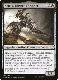Whenever Armix, Filigree Thrasher attacks, you may discard a card. When you do, target creature defending player controls gets -X/-X until end of turn, where X is the number of artifacts you control plus the number of artifact cards in your graveyard.