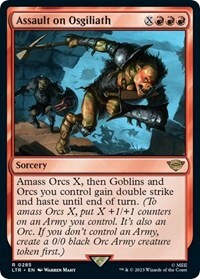Amass Orcs X, then Goblins and Orcs you control gain double strike and haste until end of turn. (To amass orcs X, put X +1/+1 counters on an Army you control. It's also an Orc. If you don't control an Army, create a 0/0 black Orc Army creature token first.)