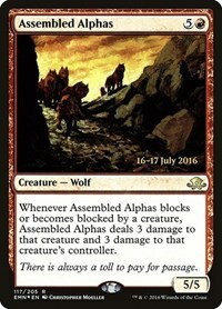 Whenever Assembled Alphas blocks or becomes blocked by a creature, Assembled Alphas deals 3 damage to that creature and 3 damage to that creature's controller.