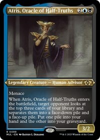 When Atris, Oracle of Half-Truths enters the battlefield, target opponent looks at the top three cards of your library and separates them into a face-down pile and a face-up pile. Put one pile into your hand and the other into your graveyard.