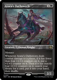 Whenever Ayara's Oathsworn deals combat damage to a player, if it has fewer than four +1/+1 counters on it, put a +1/+1 counter on it. Then if it has exactly four +1/+1 counters on it, search your library for a card, put it into your hand, then shuffle.