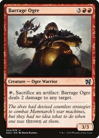 T, Sacrifice an artifact: Barrage Ogre deals 2 damage to any target.
