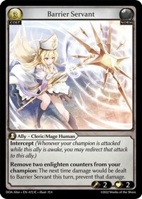 Remove two enlighten counters from your champion: The next time damage would be dealt to Barrier Servant this turn, prevent that damage.
