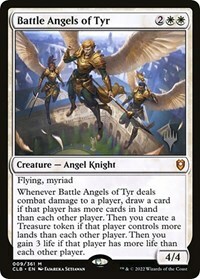Whenever Battle Angels of Tyr deals combat damage to a player, draw a card if that player has more cards in hand than each other player. Then you create a Treasure token if that player controls more lands than each other player. Then you gain 3 life if that player has more life than each other player.