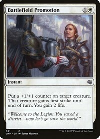 Put a +1/+1 counter on target creature. That creature gains first strike until end of turn. You gain 2 life.