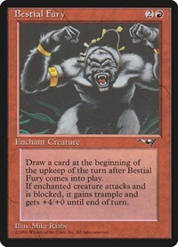 Draw a card at the beginning of the upkeep of the turn after Bestial Fury comes into play.If enchanted creature attacks and is blocked, it gains trample and gets +4/+0 until end of turn.