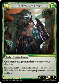 Blackmarket Broker has stealth as long as your champion has three or more preparation counters on them.