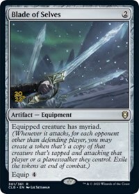 Equipped creature has myriad. (Whenever it attacks, for each opponent other than defending player, you may create a token that's a copy of that creature that's tapped and attacking that player or a planeswalker they control. Exile the tokens at end of combat.
