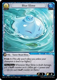 [Class Bonus] Whenever Blue Slime is dealt damage, put a buff counter on it. (Allies get +1 power and +1 life for each buff counter on them.)