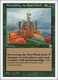 Borrowing the East Wind deals X damage to each player and each creature with horsemanship. (This includes you and your creatures with horsemanship.)