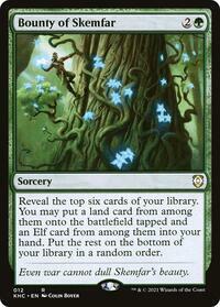 Reveal the top six cards of your library. You may put a land card from among them onto the battlefield tapped and an Elf card from among them into your hand. Put the rest on the bottom of your library in a random order.