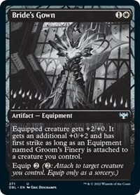 Equipped creature gets +2/+0. It gets an additional +0/+2 and has first strike as long as an Equipment named Groom’s Finery is attached to a creature you control.