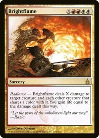 Radiance — Brightflame deals X damage to target creature and each other creature that shares a color with it. You gain life equal to the damage dealt this way.