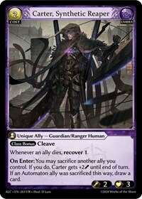 On Enter: You may sacrifice another ally you control. If you do, Carter gets +2 power until end of turn. If an Automaton ally was sacrificed this way, draw a card.
