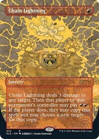 Chain Lightning deals 3 damage to any target. Then that player or that permanent's controller may pay RR. If the player does, they may copy this spell and may choose a new target for that copy.