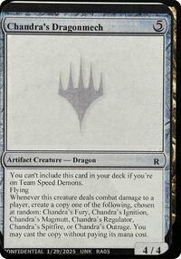 Whenever this creature deals combat damage to a player, create a copy one of the following, chosen at random: Chandra's Fury, Chandra's Ignition, Chandra's Magmutt, Chandra's Regulator, Chandra's Spitfire, or Chandra's Outrage. You may cast the copy without paying its mana cost.