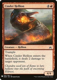 When Cinder Hellion enters the battlefield, it deals 2 damage to target opponent.