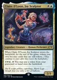 When Claire D'Loon, Joy Sculptor enters the battlefield, for the rest of the game, tokens you own become cards that are still tokens. (They continue to exist after they leave the battlefield.)