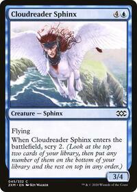 When Cloudreader Sphinx enters the battlefield, scry 2. (Look at the top two cards of your library, then put any number of them on the bottom of your library and the rest on top in any order.)