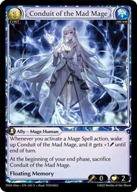 Whenever you activate a Mage Spell action, wake up Conduit of the Mad Mage, and it gets +1 power until end of turn.