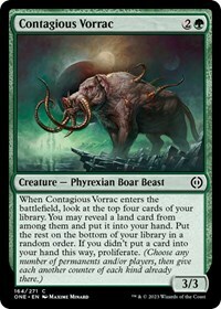 When Contagious Vorrac enters the battlefield, look at the top four cards of your library. You may reveal a land card from among them and put it into your hand. Put the rest on the bottom of your library in a random order. If you didn't put a card into your hand this way, proliferate. (Choose any number of permanents and/or players, then give each another counter of each kind already there.)