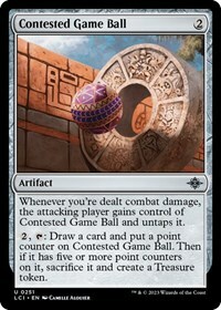 2, T: Draw a card and put a point counter on Contested Game Ball. Then if it has five or more point counters on it, sacrifice it and create a Treasure token.