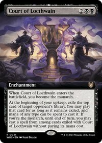 At the beginning of your upkeep, exile the top card of target opponent's library. You may play that card for as long as it remains exiled, and mana of any type can be spent to cast it. If you're the monarch, until end of turn, you may cast a spell from among cards exiled with Court of Locthwain without paying its mana cost.