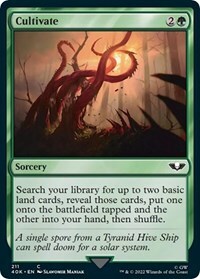 Search your library for up to two basic land cards, reveal those cards, put one onto the battlefield tapped and the other into your hand, then shuffle.
