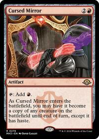 As Cursed Mirror enters the battlefield, you may have it become a copy of any creature on the battlefield until end of turn, except it has haste.