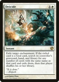 Exile target enchantment. If the exiled card is a God card, search its controller's graveyard, hand, and library for any number of cards with the same name as that card and exile them, then that player shuffles his or her library.