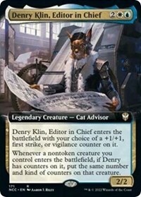 Denry Klin, Editor in Chief enters the battlefield with your choice of a +1/+1, first strike, or vigilance counter on it.
