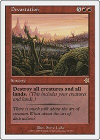 Destroy all creatures and all lands. (This includes your creatures and lands.)