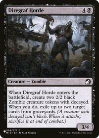 When Diregraf Horde enters the battlefield, create two 2/2 black Zombie creature tokens with decayed. When you do, exile up to two target cards from graveyards. (A creature with decayed can't block. When it attacks, sacrifice it at end of combat.)
