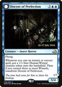 Whenever you cast an instant or sorcery spell, put a 1/1 blue Human Wizard creature token onto the battlefield. Then if you control three or more Wizards, transform Docent of Perfection.
