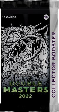 Each Double Masters 2022 Collector Booster contains 15 cards and 1 Traditional Foil double-sided token, with a combination of 4 cards of rarity Rare or higher, 2–6 Uncommon, and 5–9 Common cards. Every pack contains 10–11 Traditional Foil cards and 1 Rare or Mythic Rare Foil-Etched card. Textured Foil Mythic Rare in 3% of boosters.