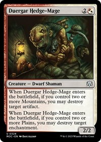 When Duergar Hedge-Mage enters the battlefield, if you control two or more Mountains, you may destroy target artifact.