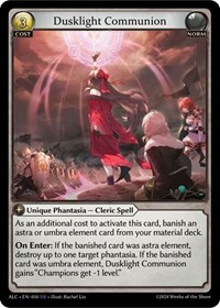 On Enter: If the banished card was astra element, destroy up to one target phantasia. If the banished card was umbra element, Dusklight Communion gains "Champions get -1 level."