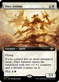 If you control five or more untapped lands, Dust Animus enters the battlefield with two +1/+1 counters and a lifelink counter on it.