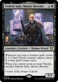 Whenever you play a creature spell, put X 1/1 black Thrull creature tokens into play, where X is that spell's converted mana cost. When you control seven or more Thrulls, sacrifice Endrek Sahr, Master Breeder.