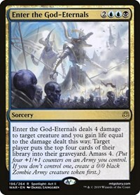 Enter the God-Eternals deals 4 damage to target creature and you gain life equal to the damage dealt this way. Target player puts the top four cards from their library into their graveyard. Amass 4. (Put four +1/+1 counters on an Army you control. If you don't control one, create a 0/0 black Zombie Army creature token first.)