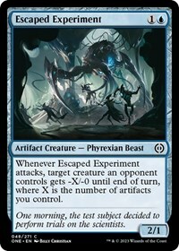 Whenever Escaped Experiment attacks, target creature an opponent controls gets -X/-0 until end of turn,, where X is the number of artifacts you control.