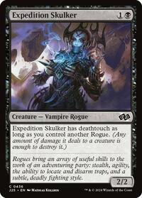 Expedition Skulker has deathtouch as long as you control another Rogue. (Any amount of damage it deals to a creature is enough to destroy it.)