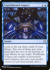Look at the top three cards of your library. Put one of them into your hand and the rest on the bottom of your library in any order. Proliferate. (Choose any number of permanents and/or players, then give each another counter of each kind already there.)
