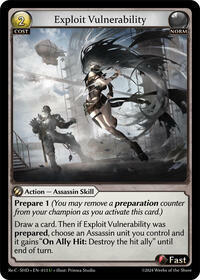 Draw a card. Then if Exploit Vulnerability was prepared, choose an Assassin unit you control and it gains "On Ally Hit: Destroy the hit ally" until end of turn.